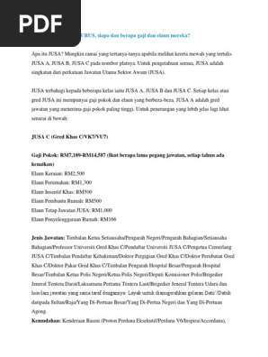 Rm500 elaun tetap jawatan jusa: Jusa c (gred khas c/vk7/vu7) gaji pokok: Jusa ini terbahagi kepada tiga kelas iaitu jusa a, jusa b, dan jusa c. Jan 09, 2018 · "sebelum kita bercerita lanjut mengenai jusa dan gred gaji mereka marilah kita faham apa sebenarnya maksud sebenar jusa itu. Setiap kelas jusa ini mempunyai gaji asas ataupun pokok dan elaun yang makin meningkat mengikut gred c kepada gred a. Jusa a merupakan tangga ataupun kelas tertinggi dalam kelas ini.