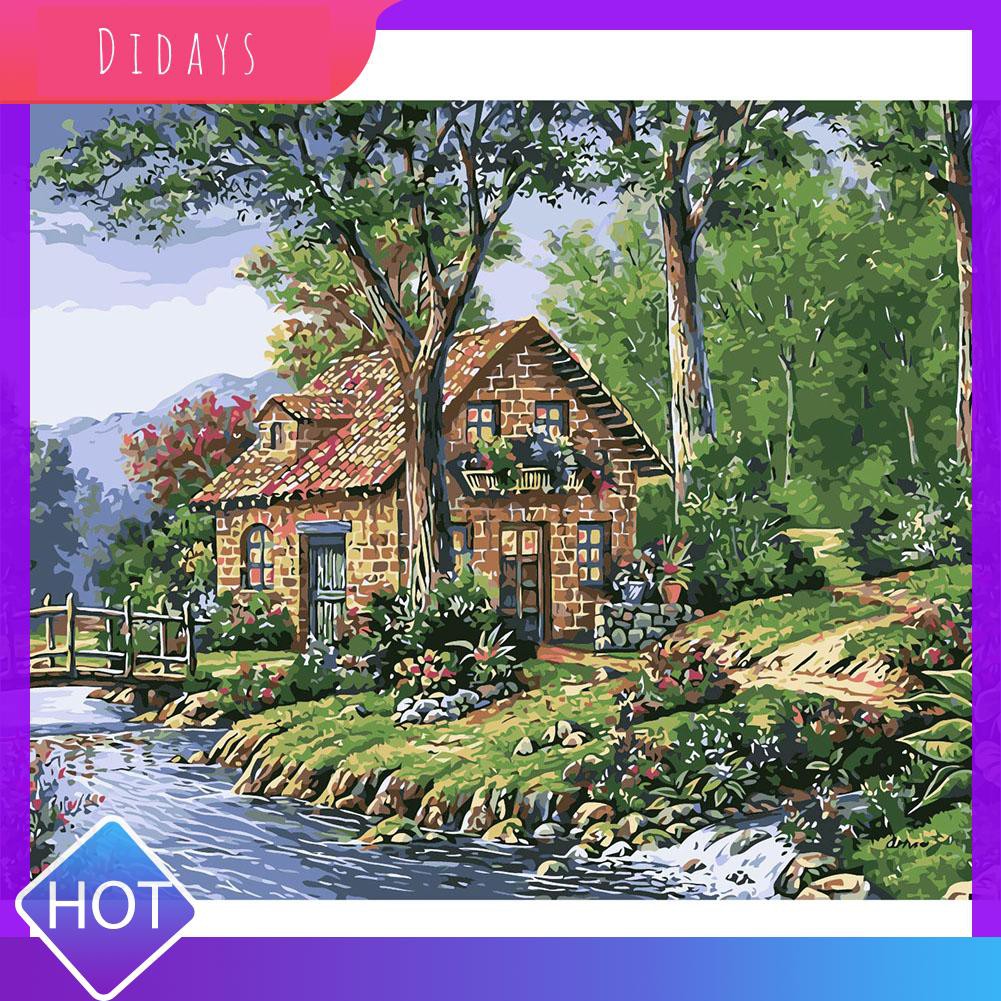 Lukisan rumah di pinggir sungai.